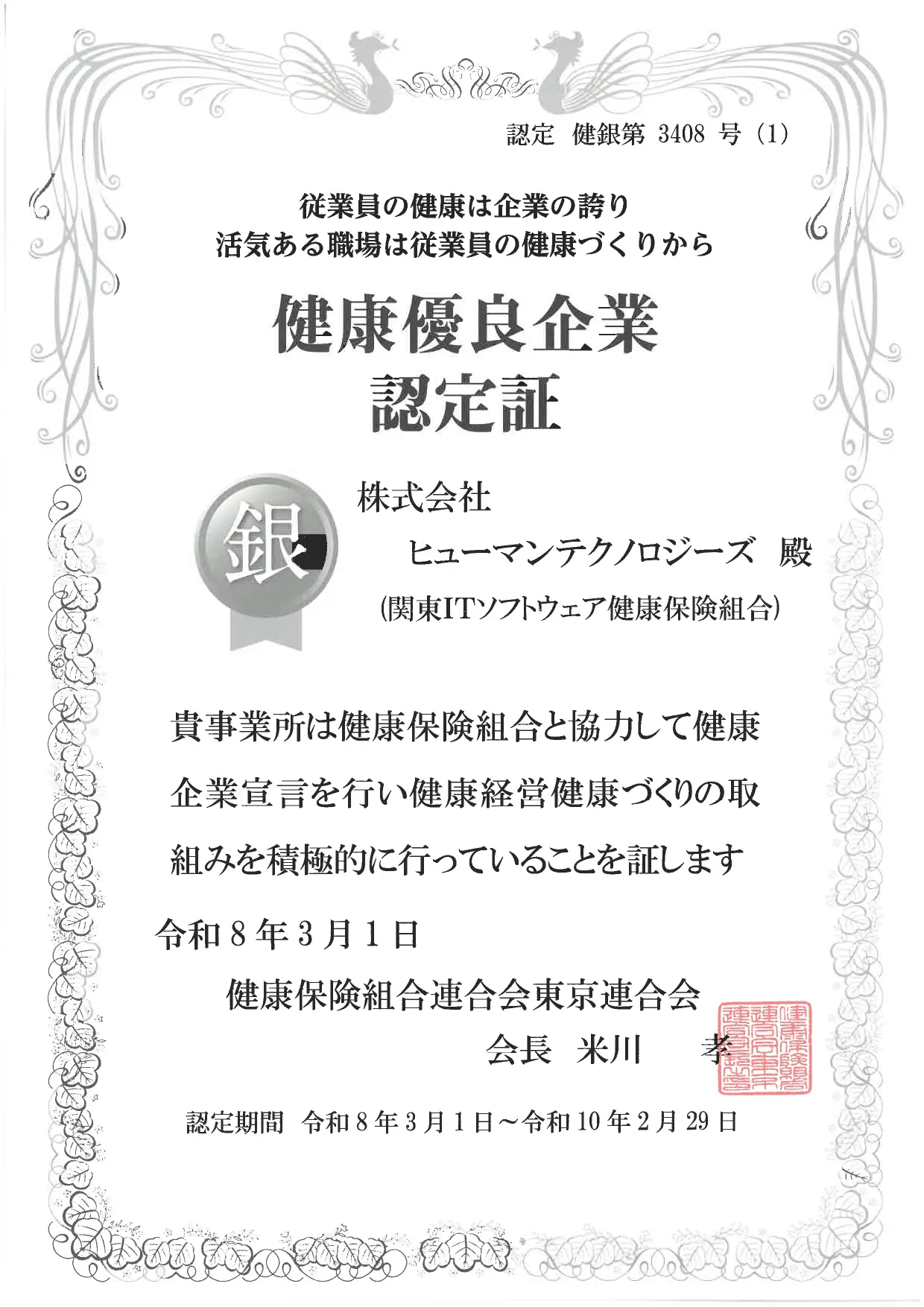 昨年に引き続き、2026年3月1日付で健康優良企業「銀の認定」を更新いたしました。